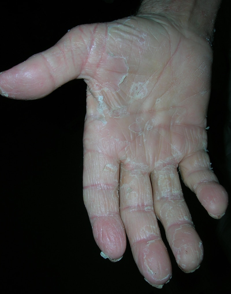 Lee, YC, Rycroft, RJ, White, IR, McFadden, JP. » Peeling palmaire focal récurrent ». Australas J Dermatol. vol. 37. 1996. p. 143-4. (Trois cas de desquamation palmaire récurrente, dont deux initialement pris pour des dermatites chroniques. L’article décrit les critères cliniques pour différencier ces entités.)