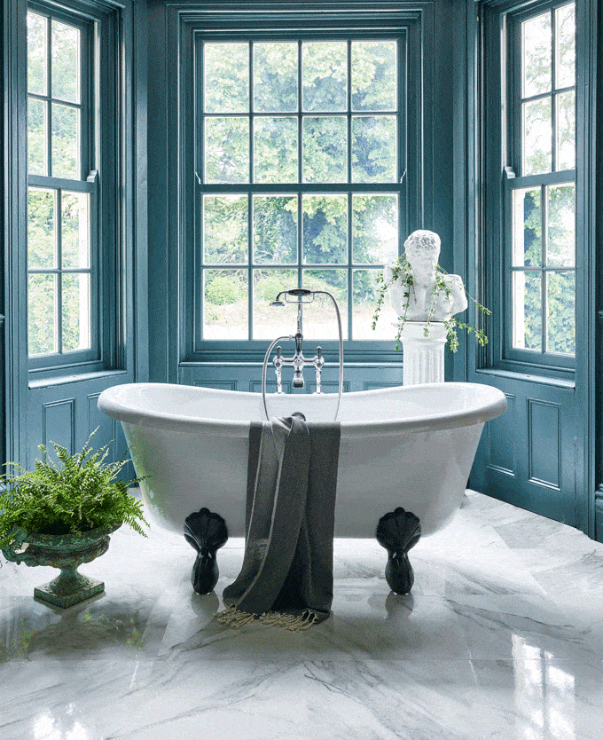 Dans cette salle de bain étroite, la combinaison d’une fenêtre fixe et d’une grande lucarne bouleverse totalement la perception de l’espace (image : IQ Glass).