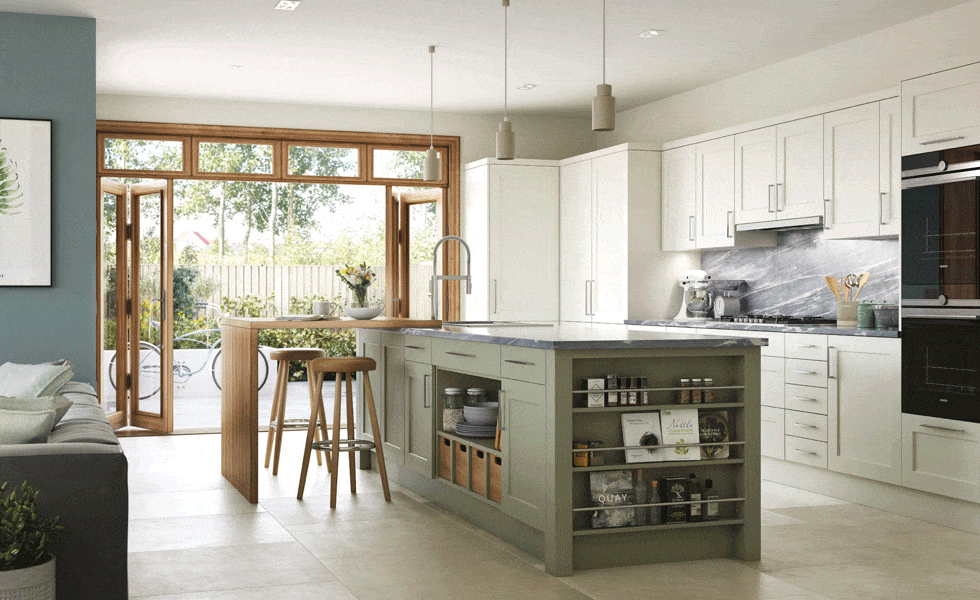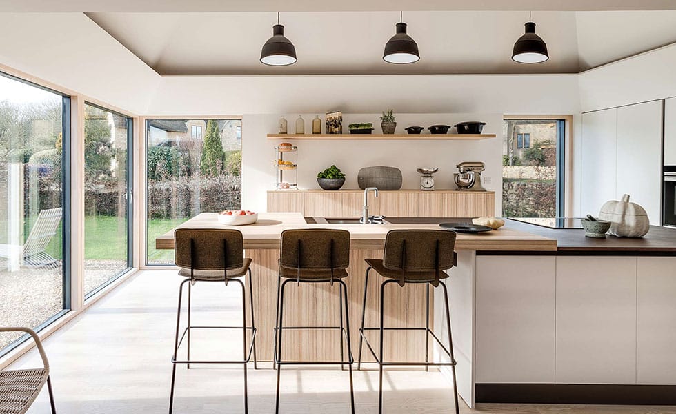 Dans cette cuisine champêtre, les pliants en bois et les fenêtres de bureau réchauffent l’atmosphère tout en inondant l’espace de lumière (image : Mereway Kitchens).