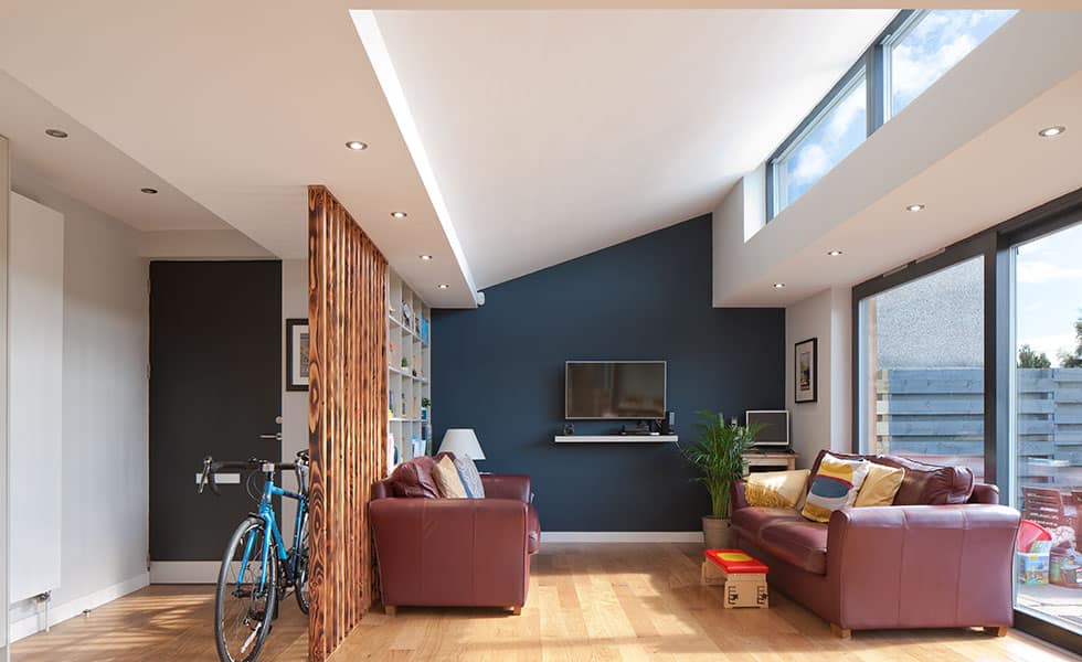 Dans cette extension de bungalow, les fenêtres en imposte optimisent l’apport lumineux jusqu’au cœur des pièces.